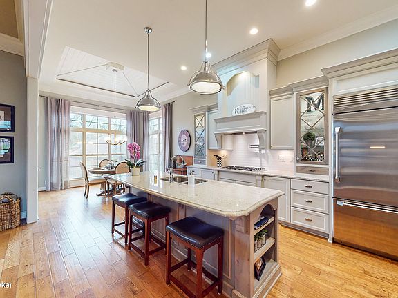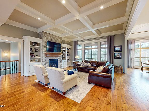 Welcome to Shakes Run! This award winning, 2014 Homearama ranch spared no detail. The open floor plan with natural light throughout also includes 11 foot coffered ceilings upstairs and downstairs, hand scraped hardwood flooring, crown molding, and more. The eat-in kitchen is packed with a large island, plenty of cabinet space, and a gourmet appliance package. Off your breakfast nook, you will find a screened in deck that offers privacy backing up to a wooded view - perfect for your morning coffee! The primary suite overlooks the wooded view as well. The primary bathroom boasts a double entry, frameless glass and custom tile shower, free standing soaker tub, and double vanities! Make your way to the lower level, where you will find a custom bar and huge family room - great for entertaining! Outside offers a covered and uncovered patio with built-in fireplace. There is a separate garage in the lower level as well to store all of your yard equipment. The fifth bedroom is currently being used as an exercise room. The basement also offers plenty of storage! Other features include: alarm system, sound system throughout the entire home, quad-zone A/C, custom finishes, granite countertops throughout, plenty of closet space, and so much more! You have to see it for yourself! Schedule a showing today!