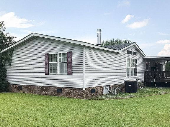 Lovely home on level lot (almost one acre), backing to farmland. Enjoy a peaceful view on the covered back deck or from the large eat in kitchen. The kitchen features plenty of cabinets, an island, large pantry, and bar seating with pass-through to the living area. A laundry/mud room off the kitchen includes washer/dryer, and small freezer. The huge living area with vaulted ceilings and lots of windows has a gas fireplace, and includes an area for dining or office space The master suite offers a walk-in closet, linen cabinet, a double sink vanity, soaking tub, and separate shower. On the opposite end of the house there are two more bedrooms and another full bath with double vanity and tub/shower combo. All rooms and outdoor area have ceiling fans. Outside features include a large wrap around deck with gates, covered sitting area, handicap accessible ramp to deck and back door, and a covered front porch. The gravel driveway has plenty of parking, and there are two storage sheds on the property. The riding lawn mower can be negotiated in the sale. Appliances included are washer, dryer, dishwasher, electric range, refrigerator, and separate freezer. Public water, septic tank. New A/C in 2021 This home needs a bit of TLC and is priced to sell as is. With some cosmetic updates, you can quickly call this home your own! A pre approved finance letter is required in order to arrange a tour of the house. Note: The floorplan may differ slightly from the picture, but not significantly.