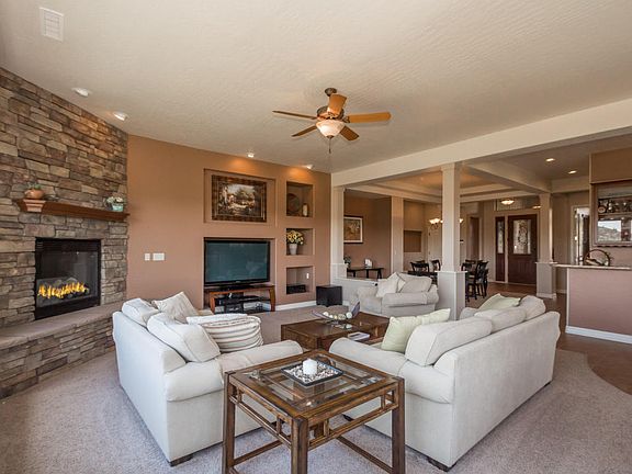 With Panoramic views this stunning Carrington home is one you must see. The gourmet kitchen features a large island, Jenn-Air appliances, cherry cabinets and a large family room for that open concept living. With the master, 3 car garage, enclosed study, laundry, guest suite, kitchen and family all on the main floor allows for easy one level living. The lower level features a walk out family room, two additional bedrooms, full bathroom and a flex room for hobby, study or work out area. The yard is spacious and quiet as the home sits at the street's end. The study features a gorgeous built in office with a double desk and has all of the amenities like the surround sound and wired for an alarm. The home is incredibly maintained and shows pride of ownership throughout the home.