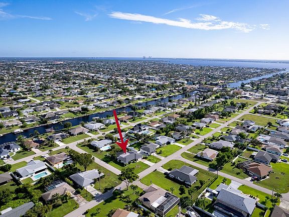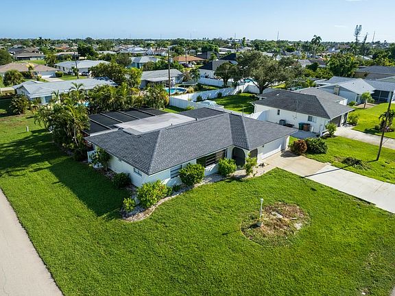 You'll love this bright and spacious pool home which sits on a large corner lot with 3 bedrooms and 2 bathrooms located near Downtown Cape Coral, a desirable area for its proximity to shopping and entertainment. NEW roof, NEW luxury vinyl flooring and a NEW pool liner! No HOA and home not in a flood zone, which offers peace of mind during stormy weather. This home offers an open-concept living area with large windows that flood the space with natural light, eat-in kitchen, split bedroom plan and spacious primary suite make this a great family home. One of the standout features of this home is the lanai, accessible through French doors from both the dining area and kitchen. The screened lanai area is a true oasis, offering a comfortable space to relax and entertain while just a few steps to the paver patio with a firepit in a fenced-in backyard. The large palm trees provide privacy to the lanai. Ready to make a move? Contact us now.