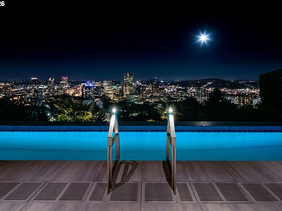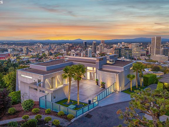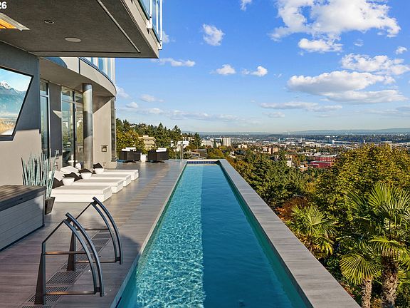 Perched high above Portland with one of the city’s most commanding panoramas, this Iconic ultra-modern masterpiece designed by renowned architect Bob Thompson delivers an epic blend of architecture, light, and cinematic indoor/outdoor living. Walls of glass capture a sweeping 270-degree view of the skyline, river, and the Cascade mountain range, while multiple terraces, a dramatic 75-foot lap pool, and refined contemporary interiors create a lifestyle centered on spectacle and serenity. Nearly 7,300 square feet of meticulously updated living space offer grand entertaining areas, a luxe main-level suite, a chef’s kitchen with Italian stone and Arclinea cabinetry, and resort-style amenities including a screening room, multi-level elevator, 3 car garage with a bar/TV with a oversized level and gated motor court, wine lounge, gym, and game room. With a seven-figure investment in recent upgrades, this home stands as one of Portland’s most extraordinary, view-driven offerings and an unmatched opportunity for buyers seeking a truly iconic vantage point.