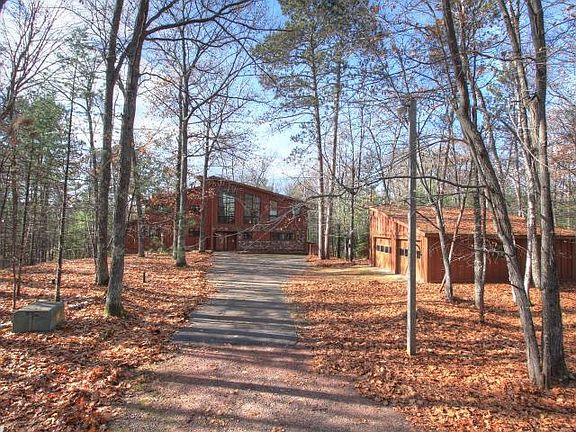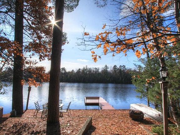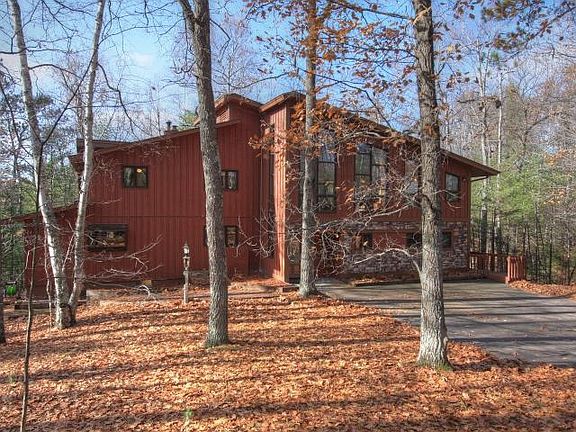 This lovely family home is tucked away on over 5 acres of wooded privacy with 284' of frontage on serene Wakefield Lake, just east of St. Germain. The chef in your family will love the Chet Meyer designed addition & kitchen remodel with cherry cabinetry, granite counter tops and huge unique island, wine rack, stainless appliances and a patio door leading to the lakeside deck for easy entertaining. You'll find yourself here most evenings enjoying the sunset views and listening to the loon calls. Wait till you see the private master en suite and loft sitting area! Large windows, vaulted cherry ceiling, cherry floors, walk-in closet, and a spacious bathroom with tile floor, double sink vanity, make-up vanity and a walk-in shower. Lots of storage too! The living room has a vaulted knotty pine beamed ceiling and a pellet stove insert. The lower level family rm has a wood burning stove and a huge bathrm with wirlpool tub. Steps lead down the gentle slope to the lake front.