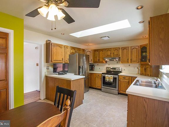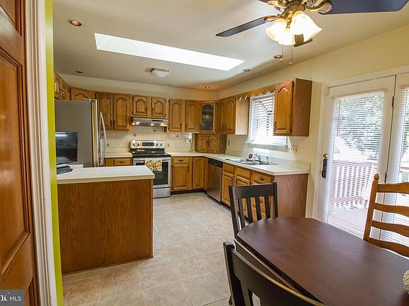 Tucked away in a private cul de sac. This well maintained 4 BD 2 BA home with 1+car detached garage. Eat in Kitchen with Updated Stainless steel appliances, recessed lights ,ceramic floor, garden window, Skylight, pantry & French Door to deck with Roll Up Canvas Awning for shade Spacious Living & Dining Room w/ Hardwood Flooring. Master Bedroom w/huge 10 x 5 walk in closet. Main Bath with Ceramic Flooring and Skylight. Wonderful Lower level--Great for Entertainment with Wet Bar/Counter Area with recessed lighting.Raised hearth wood stove and new carpeting. Walk out French Doors to Patio, 2 Bedrooms and Full Bath,Ample closets throughout. Separate Laundry Room with built in Ironing board. Many Ceiling Fans throughout! Extra freezer and Refrigerator in Garage included.
