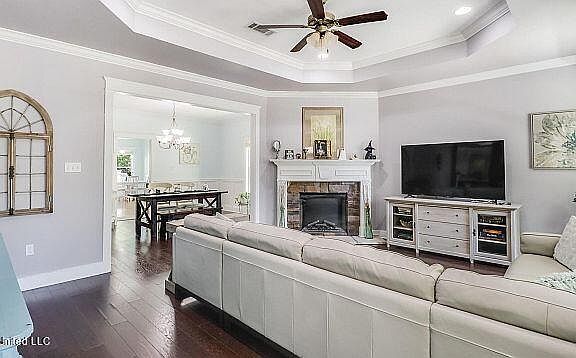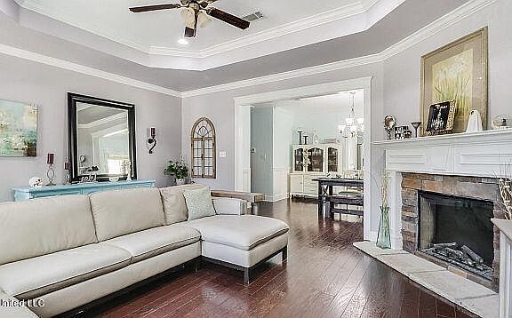 Beautiful, well-maintained home on lovely tree shaded street in Tradition. Enjoy a glass of tea or wine on the covered front porch. So many amenities....hardwood floors and ceramic tile throughout. Lovely moldings and cased openings, tray ceilings in living room and main bedroom. Formal dining room with wainscotting, fireplace, crown molding and recessed lighting in living room. Eat-in kitchen with granite counter tops, stainless appliances, pantry and access to the fabulous rear deck and yard. Main bathroom is nicely appointed with granite tops, double vanity, garden tub and separate tiled shower. Double car garage with rear access. HOA fees of $200/month include cable and internet. Located in 100% financing, USDA rural development area. This move-in ready home will not last long.
