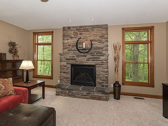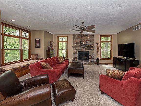 This beautiful home with impeccable finishes throughout is surrounded by over seven acres of timber. The park-like setting has plenty of space for outdoor activities. Create your own private hiking trails and enjoy viewing wild animals such as deer, turkeys, squirrels, and occasional fox, hawks, and turtles. The concrete driveway is attractively landscaped and allows for a safe play area for children and features a large basketball court. The private back yard is sizeable and is fenced in for the security of small children and pets. Enjoy parties and cookouts on the concrete patio off the walk-out basement. In the winter enjoy a neighboring sledding hill while having a bonfire in the backyard firepit. The large cedar back deck includes a screened porch large enough for outdoor dining and with a lovely view of the woods. The oversized attached three-car garage not only has a bonus room above it but a walk-out basement below it. The spacious room over the garage features dormer windows, two open finished attic cubbyholes, and a window seat with underneath storage. This room has a multitude of uses and makes a perfect play area for children or a fun hangout for teens and their friends. The basement under the garage includes a garden shed/workshop with a utility sink and direct access to the back yard. The garage basement has a finished area for storage, an exercise room, and a place for a sound-proof drum/music room. A large basement laundry room with a vanity and stainless-steel sink, medicine chest, and cupboards above the washer and dryer is also accessible from a garage stairway. The large kitchen has hickory shaker-style cabinets with ambient lighting above and below, stainless-steel appliances, a walk-in pantry with metal shelving, and includes not only a breakfast counter but an informal dining area with an adjacent formal dining room. The formal dining room is striking, featuring textured walls, hickory flooring, stained glass chandelier, a bump out area for a hutch, and a lighted tray ceiling. The kitchen flows into a sizable great room with a stone gas fireplace and window seat to enjoy the outdoor scenery. An additional room with French doors serves as a den or office. The main level has nine-foot ceilings, plenty of windows, and is decorated with elegantly crafted transoms above the interior doors. In addition to the bonus room above the garage, the second level has three bedrooms and two full baths. The primary bedroom suite includes a jacuzzi bathtub, double sink vanity, linen closet, and built-in ironing board. Two walk-in closets with pocket doors contain professionally designed modular shelving. Two additional bedrooms with walk-in closets share a hall bath with a double sink vanity and large linen closet. This floor also features a convenient laundry chute to the basement laundry room. The lower walk-out level is remarkably finished with a brick gas fireplace, surround sound theatre, wet bar with marble countertop, pool table, and full bathroom with a beautifully tiled two-person shower. There are plenty of storage areas throughout, including a storage area beneath the front porch.