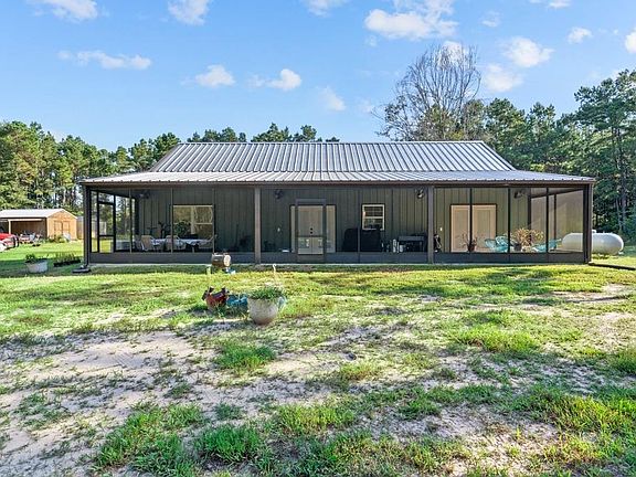 Beautiful barndominium on 14 acres that have been recently under-brushed! Open concept with sealed concrete floors, barn doors & 9' ceilings. Spacious living area with soaring ceilings. Kitchen features large island, breakfast bar, farmhouse sink, granite counters & custom shaker cabinets. Split floor plan with private primary suite, French doors, dual vanities, huge 9.5' x 5' walk-in shower & large walk-in closet. Second bedroom near hall bath with clawfoot soaking tub. Third room used as canning room with cabinets & farmhouse sink—easily converted to 3rd bedroom. Tankless water heater, spray foam insulation; including walls and attic, fully decked attic for storage. Enjoy screened-in front (53’ x 6’) & back porches (53’ x 10’). Two 12x20 storage buildings with electricity & trailer hookups. 24k whole-house generator & 500-gal propane tank. Peaceful country setting with modern comforts! Located only 15 miles from Sam Rayburn and 22 miles from Lufkin.