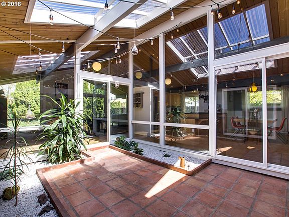 Rummer built, mid-century modern home with a light, bright central atrium, vaulted post and beam ceilings, a wall of floor to ceiling windows in the living/family room that overlook the lush,private backyard. Open floor plan design that wraps around the central atrium with a skylight that floods the home with natural light year round. Master suite and 2 additional bedrooms all on one level.