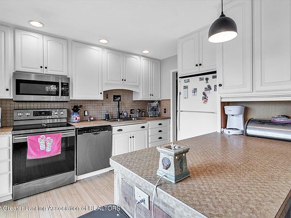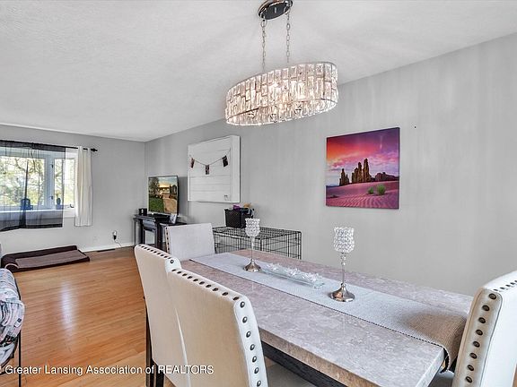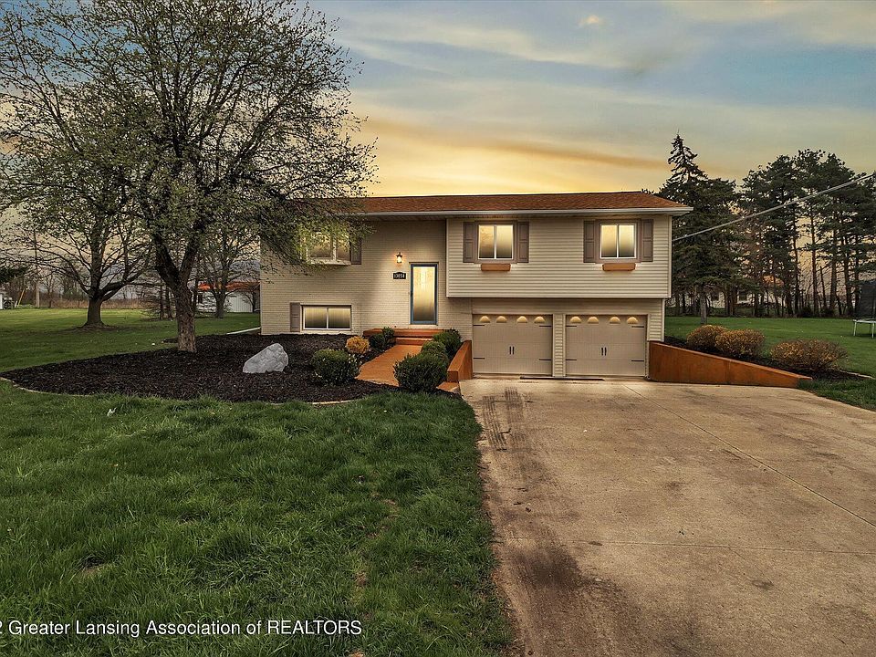 Welcome home!!!! This is a beautiful 3 bedroom, 2 full bath, bi-level home located in a desirable country setting of Grand Ledge!!! You'll enjoy 1.4 acres of tasteful, finely manicured landscaping! As you enter into a foyer with a split staircase, prepare to be wowed by the lovely chandelier. Heading up the stairs is the open floor plan to the living room, dining room and kitchen with hardwood floors. The living room has plenty of light through the bay window that overlooks a spectacular front lawn. The dining room offers a fabulous chandelier, along with a large glass sliding door that gives access to the spacious back deck and backyard. Perfect for entertaining or relaxing! The kitchen features abundant cabinets and counterspace, newer appliances plus an eat-at counter. Rounding out the the rest of this floor is the primary suite with a full bathroom, a second bedroom and the main, updated full bathroom. Enjoy brand new vinyl flooring in both bedrooms! Heading to the finished, lower level you will appreciate a large rec room, another bedroom, combined laundry and storage room and access to the attached 2.5 car garage. There is additional storage in the detached pole barn that boasts newly installed electricity. The many updates of this home include a 2019 water heater, fresh paint throughout, new light fixtures, new washer/dryer and so much more! Hot tub is reserved. This is a must-see home! Call today to schedule your private showing!