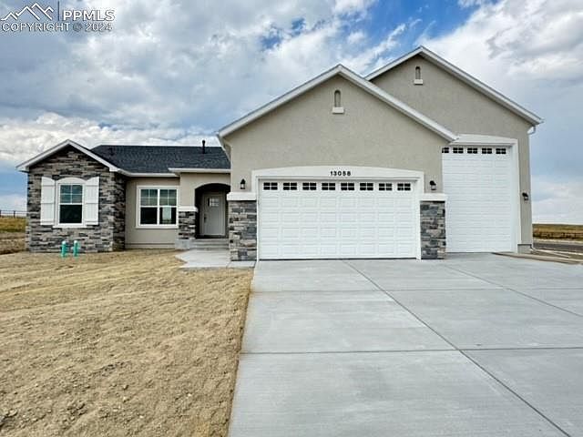 This home sits on a half-acre+ lot in The Estates at Rolling Hills Ranch in Meridian Ranch. This Monarch plan home offers a spacious great room with fireplace and a chef's kitchen with stainless steel double ovens, in-island microwave, upgraded dishwasher, gas cooktop with exterior vent range hood, and garbage disposal. The countertops are a white solid surface that provides a stunning accent to the darker cabinets. The breakfast bar/island is perfect for a quick meal, serving or prep space, while the walk-in pantry provides convenient and abundant space for groceries and appliances. This home has the extended great room, with a wall of windows on each side of the gas fireplace, that bathe the room in natural light. The dining area provides ample space for a 6-8 person table and is open to the living room. All of these main living areas, including the entry, are floored in luxury vinyl plank, for a wood look with a durable material - gorgeous and highly desirable. Also on the main level is the primary bedroom suite. This home has the optional master bath layout with full tub and walk-in shower, double vanities, toilet room and larger walk-in closet. Also on this level is another bedroom and bath, as well as the laundry room with cabinets, sink and connection to the garage. The finished basement has 9' foundation walls and has a very large rec room two bedrooms (one with walk-in closet) and a full bath. There is also a 15x15 unfinished storage area for seasonal items. The wet bar has been roughed-in for a future finish. The exterior of this home offers a 13x12 covered patio accessed from the kitchen and it has a pre-installed gas line to make grilling super easy. There is a 2 car garage with 4' front extensions plus a 48' deep RV Garage! Additional features include: air conditioning, window coverings, iron stair spindles and the garage is finished "to tape." A really nice, brand new home that is ready for move-in!