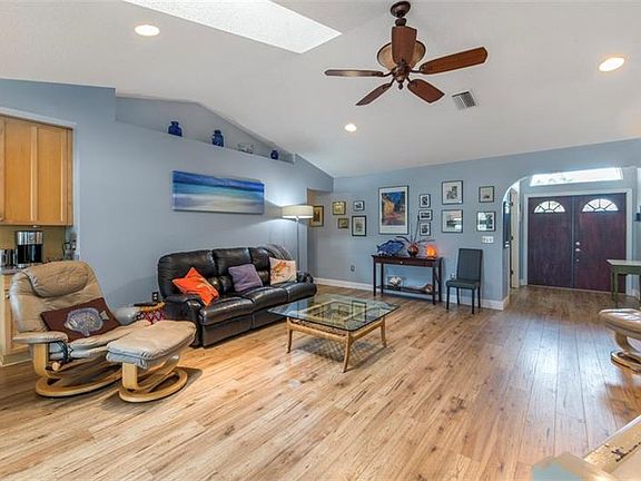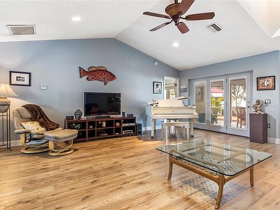 Welcome to this boating community located in beautiful Englewood, FL where you can be to the beach in less than 2 miles! As you enter your new home you are greeted with a wide open great room with a direct sight to your fully fenced backyard. Your first bedroom is located to your right through french doors - currently being used as a den/office space. The 2nd bedroom is right down the hall and includes a walk in closet for extra storage and there is a guest bath in between. The master bedroom is on the other side of the home and has french doors leading out the lanai. The master bath boasts a double sink vanity and walk-in shower. The kitchen and dinette area are located at the back of the home with full sight of the backyard and great room area which is great for entertaining. It includes stainless steel appliances and corian countertops with plenty of cabinet spaces including a coffee station. Beautiful wood laminate throughout the ENTIRE home for easy maintenance. Enjoy your private backyard which even includes a koi pond and is fully fenced. This corner lot gives you lots of room to enjoy the outdoors and has Florida "friendly" plants for low maintenance!