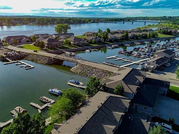 On the water in SOUTHPORT! Amazing sunsets with access to the Missouri River, located just down the street from The Pier Bar & Grill with a full service Marina. Come home by car and leave by boat to enjoy a relaxing time on the water or fish the excellent walleye of the Missouri River. Open floor plan, living room with gas fireplace and patio door to an enclosed patio overlooking the water, spacious dining room and kitchen with pantry and pull out drawers. Upper level master bedroom suite with private master bathroom suite, whirlpool tub, separate shower and vanity with two sinks. Plus a balcony deck overlooking the fabulous view of the Missouri River and the Fort Lincoln setting in the background. Basement with 3rd bedroom offering walk-thru bathroom and family room. This property is across the street from a city walking/biking trail and a few minutes from Riverwood Golf Course, major shopping and restaurants. 1/2 ownership of the dock, $75 a month association fee for lawn care and snow removal.
