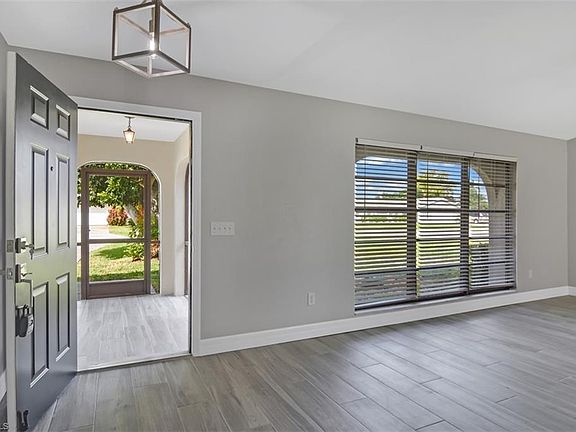 FULLY UPDATED rare 4 bedroom HOME NOW AVAILABLE. This desirable Southeast Cape Coral split floor plan home is nestled between gulf access homes with a view of the canal from this corner lot. The neighborhood is close to entertainment, shopping and convenient access to both bridges to Fort Myers. Walking through the front door, you will be greeted by the great room, full of natural light and the same wood look tile throughout the main living areas. The modern kitchen features soft close shaker cabinets, subway tile, upgraded quartz counters and a new stainless-steel appliance package. View the yard and the gulf access canal from the kitchen. The kitchen opens to a counter height window to a matching outdoor bar area on the huge lanai, perfect for summer entertaining days. The bedrooms feature plush new carpet and ceiling fans. Both of the bathrooms have been updated with the tile floors, quartz counters and brushed nickel fixtures. The master suite includes a walk-in closet and en-suite bath. Everything is new. This one won't last long.