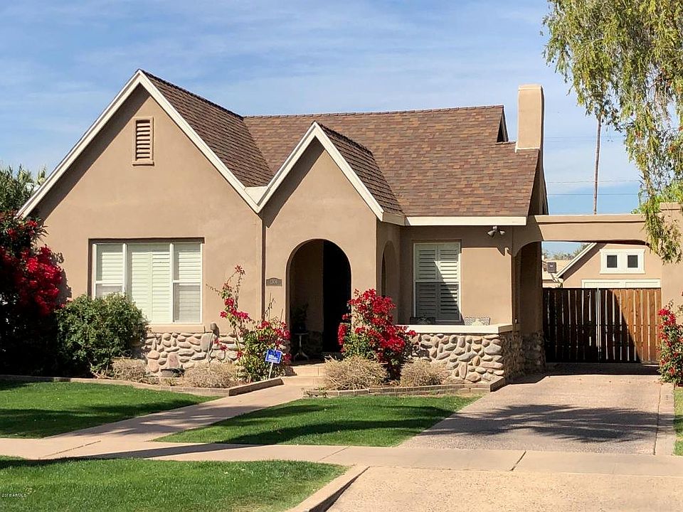 **UNIQUE remodeled home located in the FQ Historic District, walk to restaurants,cafes & enjoy nearby Symphony Hall,Chase Ballpark, art galleries or take the light rail to Tempe. The Original 1928 carved wooden front door leads inside to hardwood floors, wood burning fireplace, 11 ft Cove ceilings & gently arched passageways. Travertine floors, Dark wood cabinets, granite counters in kitchen & baths. Master bedroom with its own bathroom. Hall bath has newly resurfaced original cast iron tub. The detached garage,remodeled as a sound proof music studio also serves as a media room with energy efficient AC, loft for storage & natural wood lined walls & vaulted ceilings. Raised bed organic garden sets as a backdrop for the artfully placed stone walkway. *Priced 24k below appraisal done 9/2017*