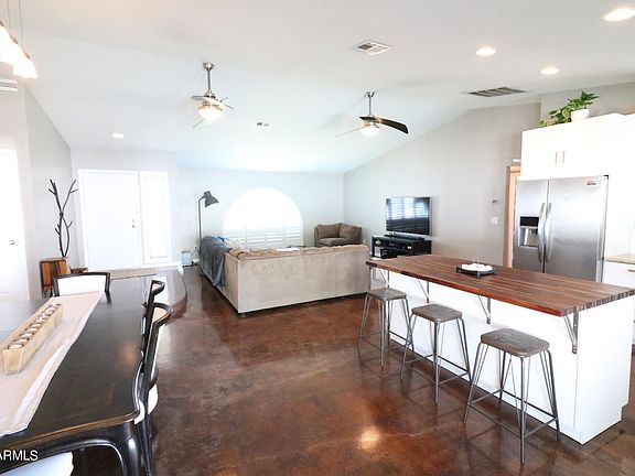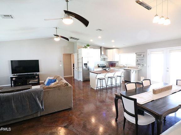 This beautiful fully remodeled 3 bedroom 2 bath ranch home is perfect for entertaining! The large open concept living space opens on to a patio and pool area that will have family and friends delighted. Everything has been updated and upgraded, including full kitchen and bath remodels, smart features (water heater, lighting, garage door, etc.), low-e windows, stunning finished concrete floors, vaulted ceilings, louvered shutters, high end matching stainless steel appliances, water softener system and a soothing color pallet. There is even plenty of room to park your boat or RV on the 40' slab beside the garage. Some furniture also available on a separate bill of sale.