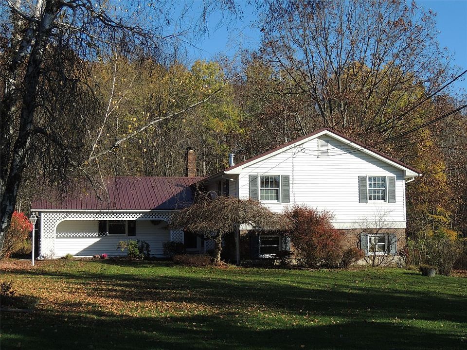 Larger than it looks raised ranch situated on flat beautiful wooded 3 Acre parcel. Country living with the convenience of being just a short drive to town. The covered front porch is a great place to sit and enjoy the changing seasons. Enter through the front door into the large foyer with two coat closets and access to the 2-car garage. Walk down the stairs to the lower level which offers a bright kitchen with plenty of counter and storage space and a pass through to the dining room which is open to the family room with gas fireplace. The dining room has sliders to the enclosed patio that leads to the private flat backyard. There is also a bedroom, newly updated full bath and laundry/utility/storage room on the lower level. The 2nd floor has a large living room with a wood burning fireplace, 3 good sized bedrooms and a full bath. There is a convenient aluminum storage shed. This spacious home has so much potential and with some updates could easily be the home of your dreams.