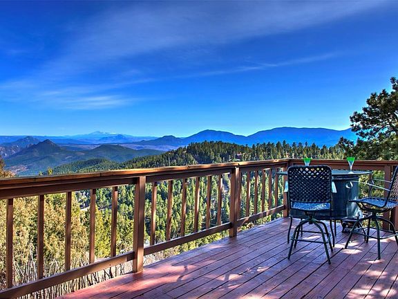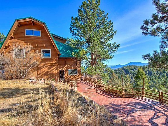 STAGGERING VIEWS! 270 degree views of Pikes Peak, the Tarryall, Kenosha Range Mountains, and the South face of Riley Peak! If views matter to you, you must come and see this property! This full log build on 2.32 acres was built to take in the views. 2-story Great Room features a unique hanging wood stove. Oversized vaulted Dining Room has access to the upper deck. Overlooking the Great Room (and views) is a spacious loft for office / exercise or just relaxing. Private Master Suite on the upper level. Finished walk-out lower level with access to lower deck, dry bar and pool table are included. Imagine entertaining or relaxing on the 1,700 sq. ft of cedar decking with built-in benches. Enjoy the multiple terraced flower beds. Build equity by updating to your own taste. Ask about Concessions for carpet/flooring and exterior staining when weather permits.