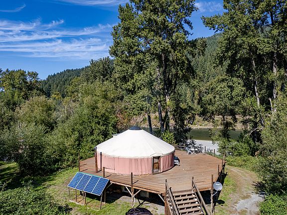 OTTER SPACE CONFERENCE CENTER & RETREAT is a rare find in Humboldt County, created as a 38-acre sustainable retreat that could be a home or a business or both. Seller Financing available. The LODGE is a newly log-built winterized three-bedroom home overlooking the wild Klamath River, with a large high-ceiling kitchen and living room that open onto wraparound covered porches on three sides. With a large open workshop in the backyard, there's lots of space for gardening and green houses. Next to it, but out of sight, is a unique 30-foot TWO-STORY YURT, perched high above the Klamath on a 50 x 50-foot deck, with a bathroom that offers a picture window view of the river while you shower. Down the spiral staircase there's a large full kitchen area for dining and living. This property extends across the river, where you can swim, fish, kayak, or just laze on the wide pebble beach. Pick your breakfast from an organic, fifty-tree ORCHARD bursting with apples, peaches, pears, cherries, plums, persimmons, apricots, and grapes, or grow your own sustainable food garden anywhere on the five-acre MEADOW of rock-free alluvial soil.The MAIN HOUSE sits just above the meadow, with 2 bedrooms, a kitchen, living room and full bath and a huge screened dining hall, where you can comfortably serve up to 40 people. The BARN houses an ATV and tool shop on the ground floor, and has two bedrooms, a bathroom, and a balcony upstairs overlooking the yard. There's also a BOAT & TRACTOR shed, a large FIREWOOD Shed and a small RED CASITA for storage. Nearby the cozy BLUE and PUMPKIN COTTAGES, have sleeping lofts, wood stoves, and kitchenettes. Tucked between them is a double YELLOW SHOWER HOUSE with two separate showers and toilets. Otter Space is set up to be a fully off the grid, sustainable way of life where the water flows freely out of the mountain, and firewood is plentiful because half the property is a Doug fir forest. It's all supported by solar power, propane, and wood stoves.The Lodge might also be used for office space if you're interested in a summer business of hosting Hip Camp and Air B&B visitors who come to see the redwoods, pick wild blackberries and swim in the river. Guests stay in one of the buildings, or camp in one of six campsites. Maple, Grotto River and Pepper Tree camps overlook the river, while Morning Meadow, Deer Meadow and Orchard Meadow camps circle the 5-acre meadow where black tail deer graze in the evenings. Each site has a picnic table and a fire pit. There's also a Camp Shower and two Outhouses. Nestled among the mountains, the nearest small town, Orick, is an hour's drive away through a redwood forest. The wild and beautiful Northern California coast is calling you!