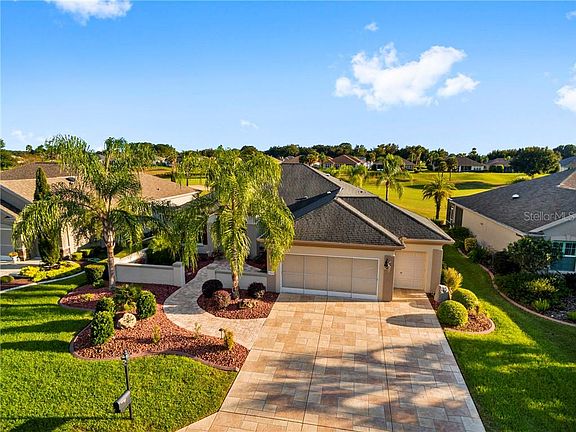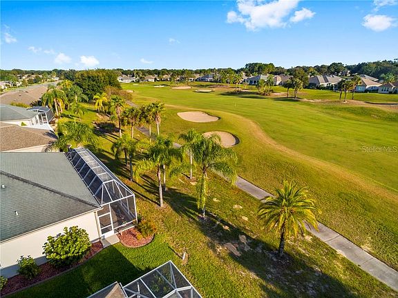 PANORAMIC GOLF COURSE VIEWS IN DEL WEBB SPRUCE CREEK GOLF AND COUNTRY CLUB. Located near community adult pool. Beautiful one of a kind home with great curb appeal from the finish on driveway to the brick pavered sidewalk & courtyard entry! Custom glass double door entry with matching transom . Den includes beautiful desk. Tile throughout the entire home, lanai and bird cage. Enclosed full-view lanai under heat and air. Newer HVAC 2010 with whole house humidifier. Irrigation well, central vac, granite counters and more. Upgrades too numerous to list. A rare find and move in ready. A home to impress! Includes entertainment center & TV w/ sound system. Monthly HOA $135.00 includes security, common area maintenance, trash removal and use of the amenities.