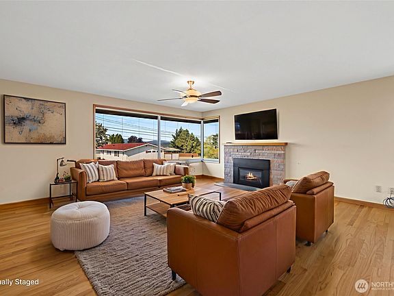 Welcome to your slice of paradise! This charming single-story home with a finished basement offers timeless appeal and breathtaking views of Mount Baker and Padilla Bay through expansive windows, including a stunning large corner window. Nestled in a prime location near town, schools, and the hospital, this well-loved gem combines convenience with serenity. Inside, original hardwood floors gleam, spacious bedrooms provide comfort, and the updated kitchen boasts sleek granite countertops perfect for culinary adventures. Outside you will find mature landscaping, a large detached garage, and expansive driveway offering ample parking for boats or RV's. Meticulously maintained, this move-in-ready home is ready for its next chapter—yours!