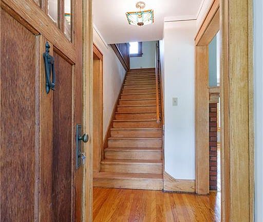 Don't miss this one! You'll find all the charm of an older home in this home. Enclosed front porch, all hardwood floors, oak woodwork, large bright living room with brick fireplace. Formal dining room. Good sized kitchen and all appliances stay! First floor 1/2 bath. Upstairs are 3 large bedrooms and full bath. Unfinished attic for additional storage. Basement has some finish. Nice laundry area. Family room too! Don't miss the two level deck looking over the fenced backyard. Lots of garden space and even a storage/garden shed. There is a large 2 1/2 car garage with opener. Exterior of the home recently painted. Great Roosevelt neighborhood. This listing won't last long and quick possession is possible.