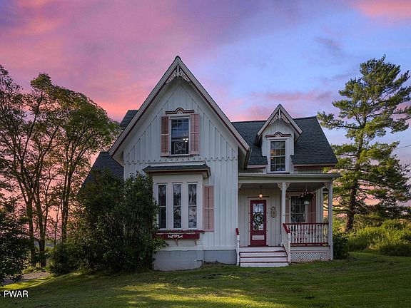Escape to tranquility in this immaculately restored Folk Victorian Farmhouse nestled on 4 pristine acres in Tyler Hill, PA. Surrounded by serene countryside, this charming retreat seamlessly blends rustic charm with modern comforts, offering 4 bedrooms and 2 bathrooms ideal for hosting guests. Inside, custom woodworking adds unique character to the open floor plan, complemented by hardwood floors and a cozy fireplace that exude warmth and charm. Outside, the farmhouse's impressive exterior showcases its original style, while an expansive porch and stunning upper balcony invite you to relax and soak in panoramic views of stone walls and sprawling meadows. Attached to to the home is expansive two story workshop for all your hobbies or primed for additional living space! A spacious barn and additional storage shed cater to your practical needs, providing ample space for equipment, a hobby farm for animals and livestock and other belongings. The vast landscape invites endless possibilities--whether you dream of gardening, raising animals, or simply embracing the peace of rural life. Just 3 miles from the wild and scenic Delaware River, this home promises both relaxation and adventure, perfect for fishing, boating, and more. Whether you seek a permanent residence or a weekend escape, this idyllic property offers charm, comfort, and a lifestyle filled with possibilities. Don't miss your chance to own a slice of countryside paradise!