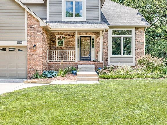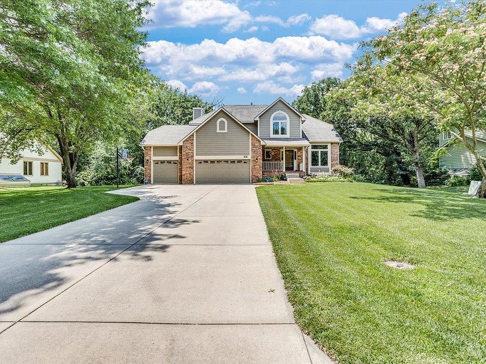 This traditional 6 BEDROOM, 3.5 Bath Derby home Located on a cul-de-sac with a gorgeous, wide-open park grassland a few steps away. Wildlife Galore: Owls, hawks, foxes, deer and more! Large, beautifully-landscaped backyard with an overhanging of mature trees and a newer sprawling cedar deck! A perfect mix of traditional floor plan with a layout that flows smoothly for entertaining. The wide front porch enters into a foyer entry with TWO separate living areas; formal living room with tall windows adjacent to the formal dining room. Bright, open kitchen has original wood floors, a formal breakfast room, eat-up bar, organizational desk nook, and flows right into the family room with extensive windows and cozy brick fireplace. The main floor also holds a separate laundry room and convenient half-bath for guests. All bedrooms in this home are extra large with views of the surrounding trees and a quiet street. Extensive storage throughout this home. Master bedroom with coffered ceiling, walk-in closet, and en suite spacious bathroom. Basement has second fireplace, 2 additional bedrooms, and an extensive wet bar! EXTRA HIGH GARAGE CELING CAN ACCOMODATE CAR LIFT ~ NEWER EXTERIOR PAINT ~ DUAL ZONED HVAC systems New in 2022 and also have new Nest thermostats ~ EXTRA LONG DRIVE FOR PARKING ~ REVERSE OSMOSIS SYSTEM ~ **NO SPECIALS** LOW HOA annual dues include neighborhood pool with on-duty lifeguard & tennis courts. Don't let this home get away in one of the most beautiful streets in Derby!