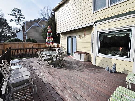 Charming cape home in desirable Exbury Subdivision! This lovely home has new hardwood floors in great room and dining room as well as half bath and newer stainless appliances. It also has newer roof, heat pump, replacement windows and water heater. First floor offers a large inviting great room with a vaulted ceiling which opens to second floor hallway, hardwood floor and wood burning fireplace, dining room with hardwood floor opens to kitchen and provides entrance to large rear deck and fenced back yard, kitchen has eat-in area, ample cabinets, bay window, and newer stainless steel appliances, laundry room with cabinets and access to garage, and half bath with hardwood floor. The second floor offers master bedroom with carpet, walk-in closet and adjoining bath. Two additional bedrooms on this level are ample size and offer generous closet space and share the hall bath. Enjoy the large 25' x 16' rear deck for entertaining with privacy fence. The lawn is beautiful with mature plantings and has been professionally landscaped. Top Chesterfield schools and convenient location!