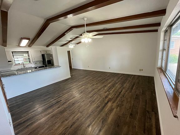 Welcome to 1307 Garland in Plainview, Texas! This inviting three-bedroom, two-bath home offers a perfect blend of modern conveniences and timeless, well built charm. Step inside to a cozy open-concept living space featuring warm wood beams across vaulted cathedral ceilings. You'll find brand-new flooring throughout, new granite countertops in the kitchen and more. Both bathrooms are completely remodeled, with all-new tile, fixtures, lighting, and updated electrical. A bonus sun porch/playroom provides relaxing backyard views, while the steel patio cover pairs with the steel fenced back yard, as well as a storage shed add function and longevity outdoors. Nestled in a great neighborhood with established trees, this home is just a block from the public pool & park, and close to Central Elem