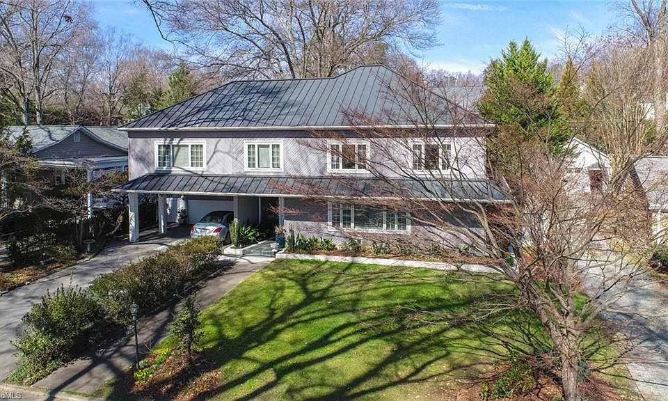 Back on the market at no fault of the sellers! Classic mid-century modern, J P Coble, NY architect. A lot of house for the $. Big rooms, Primary Bedroom up or down. Recently remodeled Kitchen, attractive metal roof, fireplaces in LR, Primary BR & outdoors in pool cabana. 4th bath in pool house. 40 x 20 in-ground pool, resurfaced inside in 2021. Patio 50 x 16 in addition to pool deck. Extensive landscaping. Latham Park across the street. Convenient to hospitals, shopping & Greensboro Country Club.