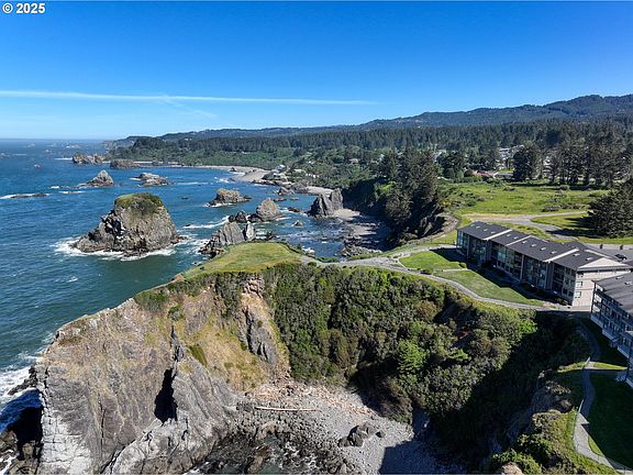 One-of-a-Kind Oceanfront Ground Floor End Unit with Breathtaking Views of the Oregon Coastline!This spectacular 3-bedroom, 2.5-bath condo offers unobstructed views of Bird Rock, Harris Beach, and the St. George Reef Lighthouse. Located in a quiet, gated community with private beach access just steps away, this rare end unit blends high-end design with the serenity of coastal living.The open-concept kitchen and living area features quartz countertops, beveled Carrara marble backsplash, a granite composite sink, and custom soft-close cabinetry with thoughtful upgrades like spice racks, a mixer lift, microwave drawer, ducted range hood, and a convection/induction range. Solid oak floors span the kitchen and living room, while Spanish tile adds warmth and elegance throughout the bedrooms and baths.Both en-suite bathrooms have been fully updated with Italian ceramic tile and frameless walk-in showers. The primary suite includes a deep cast iron soaking tub for luxurious relaxation.Enjoy ocean breezes and stunning sunsets from two private patios that extend your living space outdoors. Additional features include Hunter Douglas electric blinds, new high-end kitchen appliances, and an oversized one-car garage.Whether you're looking for a permanent residence or a peaceful retreat, this move-in-ready coastal gem offers unmatched beauty, thoughtful craftsmanship, and a front-row seat to some of the Oregon Coast’s most iconic scenery.