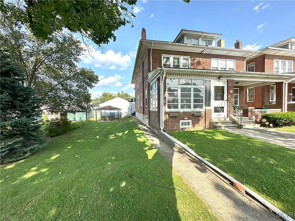 Experience the charm of desirable West End living with this 3-bedroom brick twin home, nestled on a double lot. This property features an oversized 3-car detached garage and an inviting enclosed front porch. Inside, a spacious living room with an auto-feed pellet stove and stone facade provides warmth and coziness. The formal dining room and quaint kitchen offer delightful spaces for everyday living and entertaining. The home’s charming details include beveled leaded glass windows, antique glass doorknobs, and hardwood flooring with walnut inlay, adding timeless character. With three generous bedrooms, a full bath, and two convenient half baths, comfort is assured. The third floor features a cedar closet and a flexible space that could become a fourth bedroom or studio. The finished basement adds a rec room, laundry area, and one of the half baths. Outdoors, enjoy a covered brick patio, a spacious yard, and a fruitful peach tree, perfect for relaxation and gatherings. This home blends classic charm with modern convenience—schedule your tour today!