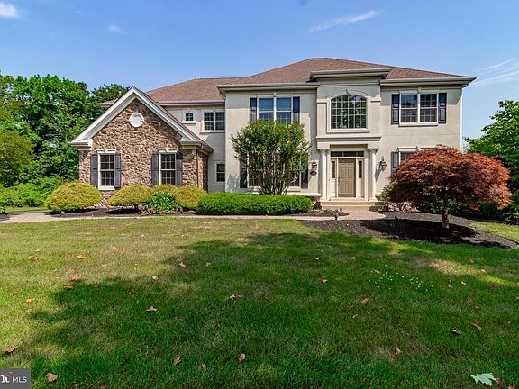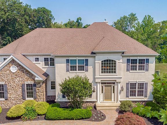 Beautiful 5 bedroom 4.5 bath partial stonefront Colonial with 3 car side garage and finished walkout basement. Built by Deluca in 2004, .This huge Montgomery model is tucked away on a premium lot in desirable and secluded Prospect Manor. Property backs to preserved open space with private wooded views. Custom Crystal stone surround inground pool with Flowing stone waterfall and adjacent hot tub. Elevated large tyvek deck with slider to Breakfast room allows you to overlook your fenced backyard oasis. Deck has stairs that lead to pool area and there is patio underneath deck with slider to finished walkout basement. No reason for your family to leave this home. Home features 9' ft 1st floor ceilings along with 2 story foyer and family room. Upgraded wood moldings, custom lighting and gleaming hardwood floors throughtout the Formal living room , dining room and office plus matching hardwood added to two story family room. Custom tile in the Kitchen area, Breakfast room and laundry room that has side entry door to driveway. Two story foyer has hardwood & antique style chandelier. Formal dining room leads to Butler's pantry that opens to one of a kind gourmet kitchen. Kitchen features authentic farm cabinetry, wrought iron hardware and freshly polished soapstone counters & farm sink. Upgraded appliances with double wall oven with microwave convention oven on top. Top of line range and with stainless exhaust hood and glass tiled backsplash. Custom tiled floor continues into breakfast room that has sliding door to deck for outside meals on cool nights. The kitchen is also oppen to huge 2 story family room with stunning two story stone gas fireplace ande 8 oversized windows drawing in bright sunshine light. Main level also has private office and oversized powder room . There are open hardwood stairs to 2nd level along with 2nd staircase off laundry room and convenient to side entry door. The 2nd level features a master suite the size of an apartment with custom tray ceiling. Adjaent sitting room and large dressing area with dual walk in closets and cherry wood wake up table. Master bath vanity with daul sinks and whirlpool tub to relax or use shower. Separate water closet. Large 2nd bedroom has private full bath with tub shower and walk in closet. Large hall bath with double vanity for good sized 3rd and 4th with double closets. Fully finished walk out lower level has a 5th bedroom with full size rear windows for plenty of light and sitting room. Door to custom tiled full bath. that features claw tub with shower. Perfect for in law, Au pair or quest suite. Huge open great room with vinyl style wood flooring,. Seaparate game room or exercise area and large storage room. Slider leads to patio under deck for cool family gathering by the pool & hot tub. Pool installed 08/2006, Basement finished 03/05 and new kitchen 2012. Quick commute to major highways and train. This a special home on exclusiive cul de-sac street in Yardley. Close to main street and great schools.
