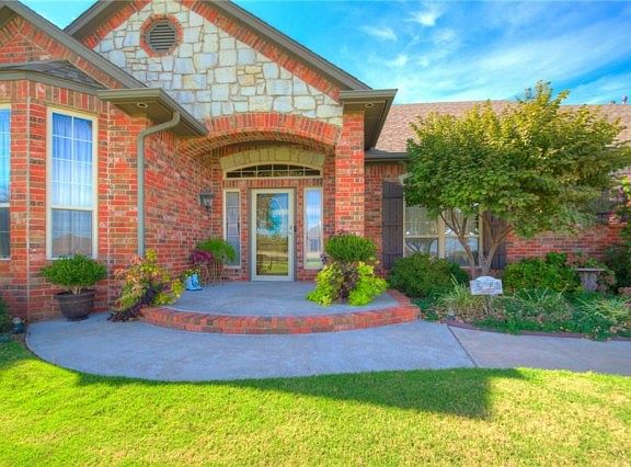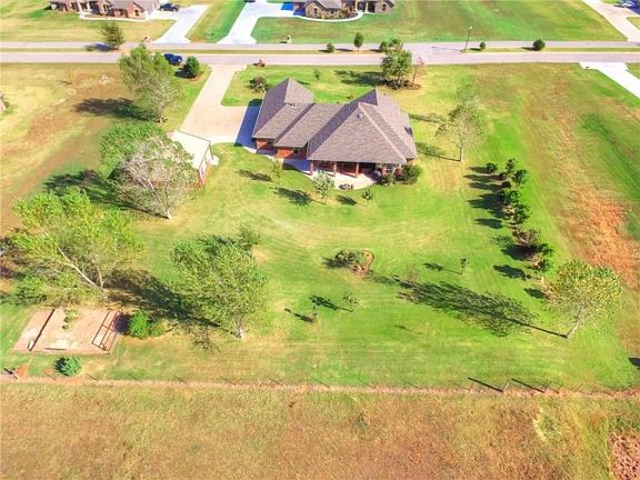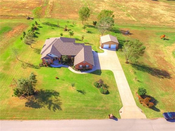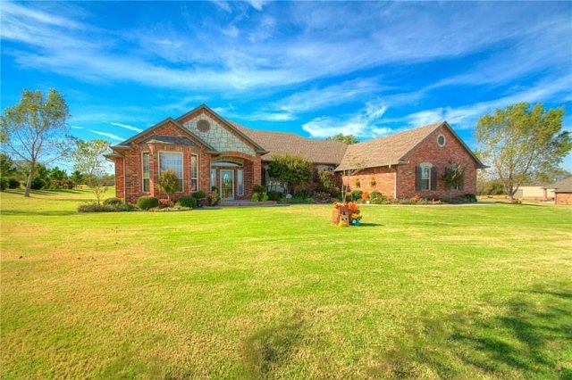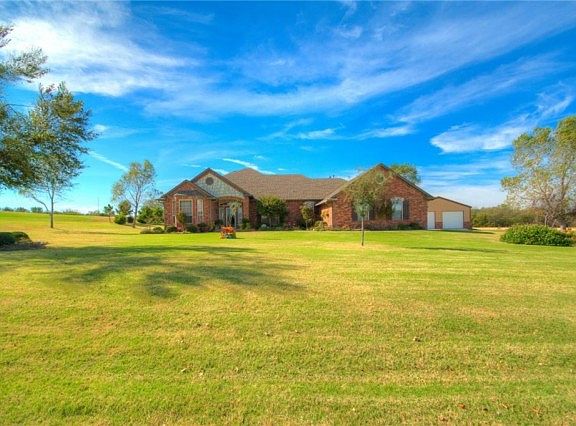 Immaculately kept Hill's home that features quality construction, exquisite woodwork, attention to detail and 6" exterior walls. The formal dining has a built-in hutch. Office space with bay windows is large enough for 2 desks. There is a nice sized sitting area with bay window in the spacious master bedroom with 2 vanities, hair station w/automatic timer, large walk-in seasonal closet with built-ins, whirlpool tub and glass shower. There is a Jack-n-Jill bath separating the 2nd & 3rd bedrooms. 1/2 bath for guests. Kitchen has large walk-in pantry, breakfast bar, pull out drawers, built-in appliances, granite and storage galore. Great covered patio for morning coffee or evening views of the Oklahoma sunsets. The 24x30 shop is insulated with electric, small storage loft area, 2 overhead and 1 walk-through door. All this on 1 acre mol minutes from major highways for easy commutes to Okc, Bricktown, FAA, Will Rogers Airport, Norman, OU, TAFB, restaurants, shopping & entertaining.