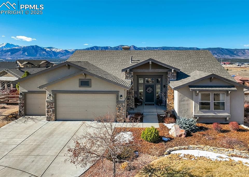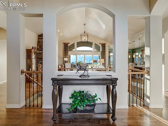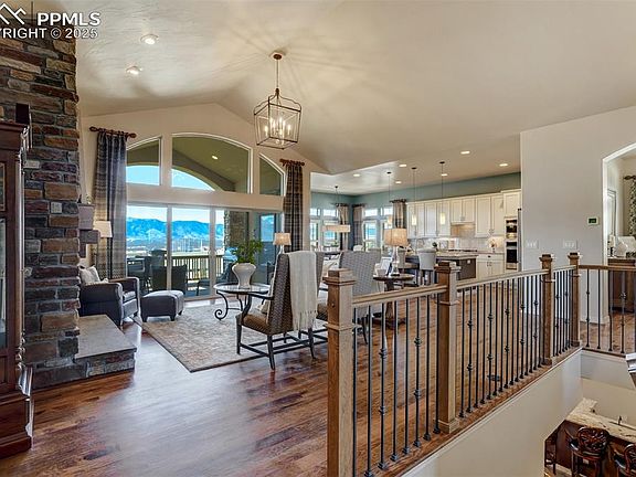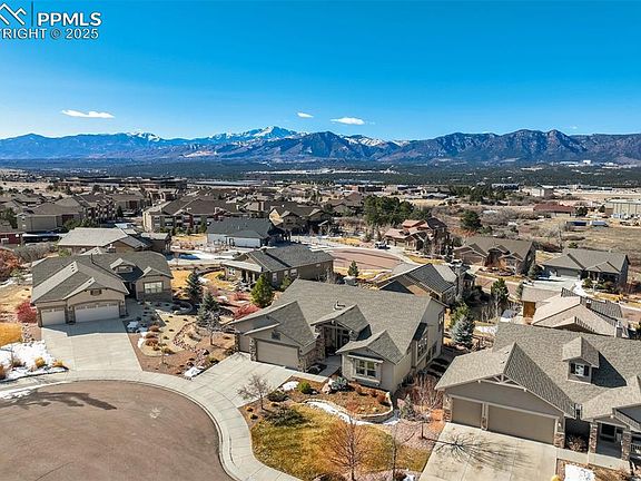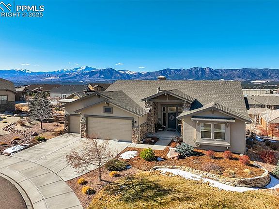 UNOBSTRUCTED MOUNTAIN VIEWS from this gorgeous home nestled in a tranquil cul-de-sac offering luxurious living with stunning panoramic views. This exquisite home features soaring ceilings, an open floor with abundant windows and natural light, beautiful hardwood floors through most of the main floor, and breathtaking views from nearly every window. The gourmet kitchen is a chef's delight, with a wall oven, convection/microwave, gorgeous granite counters, gas cooktop and an oversized island perfect for entertaining. Entertaining is a joy with a eat-in nook, oversized island, and a formal dining room. An inviting stone faced fireplace is in the heart of the home, as the family room flows into the kitchen, and a 12ft sliding glass door opens to an incredible deck with gas plumbing, an awning, and VIEWS! Escape to your private oasis in the primary suite with a large picture window, spa-like bathroom, a large tub, and a double headed shower with a bench AND California Custom Closet! The spacious walk-out basement shines with light and high ceilings, a cozy gas fireplace, and multiple options for use. The wet bar provides 2 wine fridges, one holds up to 150 wine bottles! A junior suite and 2 more bedrooms with a Jack and Jill bathroom complete the space perfectly! Multiple outdoor living spaces include a second covered patio off the basement, and the parklike fenced yard offers a serene water feature, and is perfectly landscaped! Enjoy features like electric sun screen, hideaway screen doors on walkout and deck, plantation shutters, Hunter Douglas shades, wood shelving in closets, hand trowled walls, Anderson Storm Door and more! An optional membership to Flying Horse resort and club can complete the resort lifestyle! Enjoy easy access to entertainment, restaurants, healthcare, shopping and the prestigious Academy School District 20's IB Discovery Canyon Campus K-12 and The Classical Academy! Enjoy luxury living along with convenience and community!