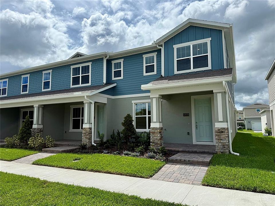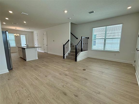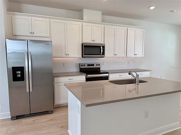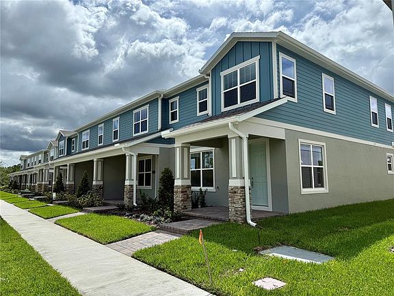 Step into this stunning corner townhouse offering 3 bedrooms, 2.5 bathrooms, and a spacious private loft on the second floor. The open-concept family room sets the tone with elegant details, soaring 9-foot ceilings, and 8-foot doorways that create a bright, airy feel throughout. The chef-inspired kitchen features quartz countertops, custom gray concrete island, abundant cabinetry, and a generous dining area perfect for both everyday living and entertaining. Outside, a paver patio and covered walkway connect directly to your two-car garage, keeping you protected on rainy days. You'll also enjoy two additional driveway spaces plus off-street parking right out front. Located just 5 minutes from the Disney entrance and the lively Flamingo Crossing shopping and dining hub, this home also offers quick access to Route 429, putting Orlando's top destinations within easy reach.