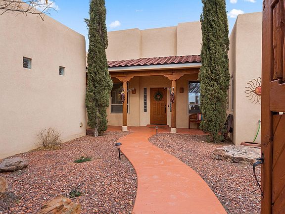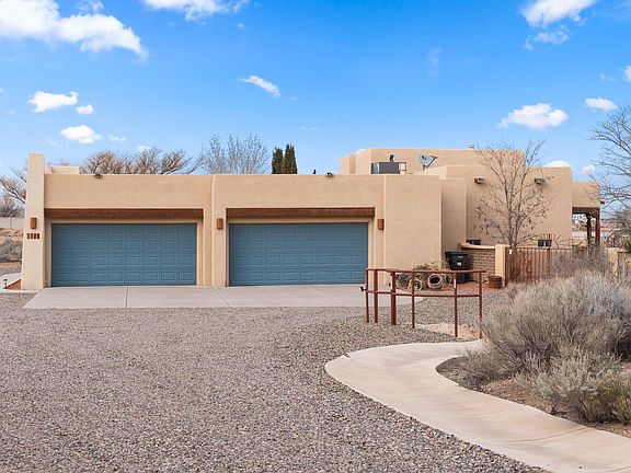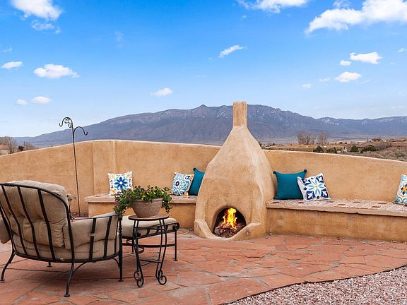 Exquisite southwest style Tre Taglio masterpiece nestled on a 2.34 acre property in the Rio Rancho Estates community. Stunning living area with a soaring beamed tongue and groove ceiling, floor to ceiling fireplace and a wall of windows showcasing those breathtaking views! Step past the hand carved columns and vigas into the spaciously designed kitchen with custom cabinetry, granite countertops, built-in oven, microwave, cooktop, trash compactor, fridge, skylight, island with seating, workstation & dining space. In-laws suite w/ sitting area and bath. Luxurious owner's suite with resort feel, amazing views, fireplace and bath! Bath hosts his/hers sinks, a jetted tub, walk-in shower and closet! Amazing yard with covered patio plus an open patio with fireplace and magnificent views!