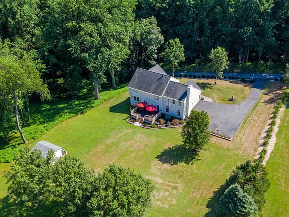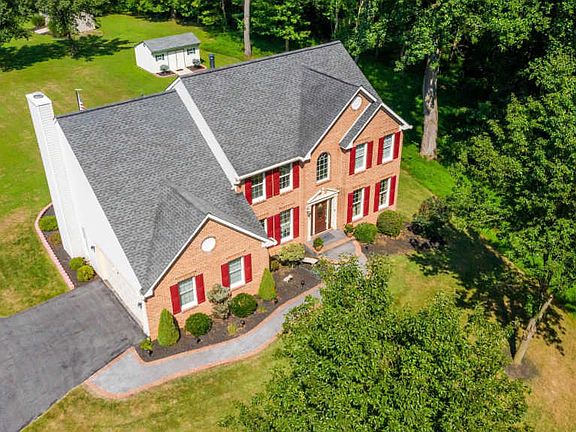 Stately brick front colonial is perfectly set on a 1.4 acre open lot with wooded backdrop! A foyer entry welcomes you inside to find a formal living room, dining room, and office, perfect for working from home! Remodeled eat-in kitchen boasts sleek granite counters, center island, white cabinets, and glass mosaic backsplash! Open family room with wood burning fireplace. Step outside to the large deck overlooking the backyard. Owner's suite with cathedral ceiling features a walk-in closet with closet system and attached bathroom with frameless shower, separate tub, and dual sink vanity. Lower level hosts a media room, ample storage, and a workshop area. Custom dream garage for the car enthusiast! Recent updates include HVAC system, oil furnace, new flooring on the main level, and more! Location offers privacy yet convenient to retail and dining hot spots, close proximity to Liberty High School! Welcome home!