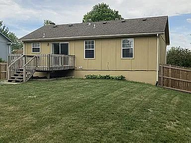 Single family clean home located in Lee's Summit West School District. Three bedrooms, two bathrooms, finished basement that makes a great private area for teenager, elder roommate or even parents. Two car attached garage, with door openers. Back deck that leads to a large totally fenced backyard. Minimum 12-month lease. Renter is responsible for all utilities and maintenance of the yard. Small dogs are allowed if under 40 lbs., with a $600 non-refundable deposit, plus $45/month additional rent. Rent will be due on the 1st of each month, there will be a late fee if not paid in FULL by the 5th of each month.