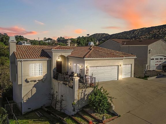 Discover this stunning hillside VIEW home in the Santa Susanna Knolls. Boasting over 3000 sqft, this property features four bedrooms, including a main-level bedroom perfect for guest or an office and 3 full baths all on a 10,000 sqft lot. The expansive kitchen is a chef's dream, with granite counters, stainless steel appliances, travertine tile floors and a cozy breakfast nook offering breathtaking views. The spacious family room , complete with fireplace and hardwood floors, opens up to panoramic city and mountain views. The inviting living room also features a fireplace, hardwood floors and more gorgeous vistas. The master suite is a true retreat, featuring a sitting area, luxurious master bath, and a large walk-in closet, all with those incredible views. Additional features include dual pane windows throughout, dual central air and heat system, three car garage, possible RV access, private deck overlooking the peaceful mountains. Designed with comfort and style for this area, this custom home was built with all concrete siding and an internal sprinkler system. Don't miss out on this exceptional property with BREATHTAKING VIEWS!