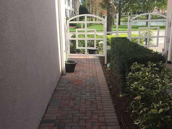 Beautiful one-of-a-kind 2 bedroom, 2 bathroom condo with an office and 1 car garage. Located in an upscale, guard/gated community in Bella Trae Championsgate. Impressive clubhouse with lots of amenities, including a heated pool, hot tub and state of the art gym. This pristine condo is a must-see! It has been extensively upgraded by a master carpenter. These amazing upgrades include crown molding in all rooms (including bathrooms), columns, lots of wainscoting, decorative window and door headers, custom master bedroom closet, custom storage bench in breakfast nook, and a fireplace. (Est. $40k+) All flooring is laminate wood and tile. Lovely view of conservation area from screened lanai, which includes a custom trellis, flower box and working fountain.
