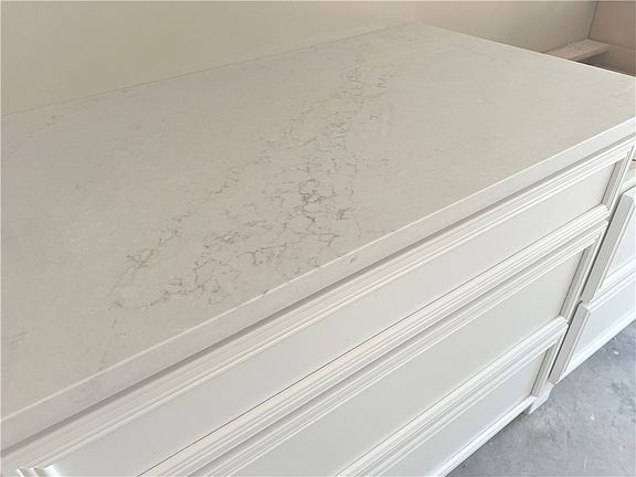 the back of the house is the master suite. The master bath has split vanities with custom cabinets, quartz countertops, large
