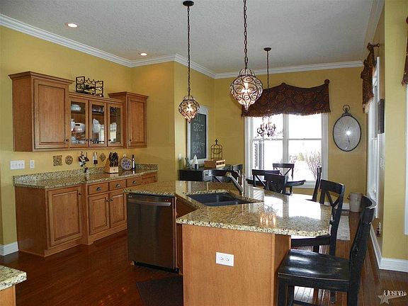 Enjoy the views from this 4 bedroom, 3.5 bath home in beautiful Bridgewater subdivision. The deck overlooks the sloping back yard and golf course/pond. The open kitchen (with granite tops), nook and hearth room allows room to entertain or it's cozy enough to curl up with your favorite book in front of the fireplace. Plenty of room in the master suite for all your bedroom furniture plus an extra space perfect for a computer desk. The master bath has double vanity, 5' shower plus a "cute as can be" slipper tub. The 2nd level has 2 bedrooms that share the Jack-N-Jill bath and bedroom #4 has it's own full bath. Other features include 8' tall doors, coffered ceilings, crown molding throughout the home and walk in closets in each room. The unfinished daylight basement is wide open and waiting for your own personal touches and plumbed for full bath and bar.