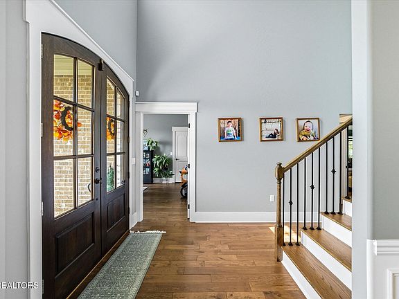 Welcome to 1308 Rippling Waters Circle — a stunning 6-bedroom, 3 full and 2 half bath custom home in the heart of Sevierville. Built in 2017, this beautifully designed residence offers over 4,300 square feet of thoughtfully crafted living space. Step inside to soaring vaulted ceilings and a bright, open layout filled with natural light. The main level features a spacious living room with a cozy fireplace, a formal dining area, and an eat-in kitchen with granite countertops, soft-close cabinetry, and modern finishes. The primary suite is conveniently located on the main floor, complete with tray ceilings and his-and-hers walk-in closets.