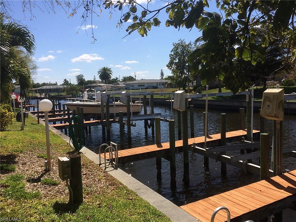 GULF ACCESS 1st floor Condo with DEEDED DOCK! . WATER and SEWER is included in the Maintenance Fee! Great SE location, 2 bedroom 2 bath condo. The living area and peaceful screened lanai overlook the heated community pool and the serene gulf access canal. The Kitchen has a large walk in Pantry, counter Breakfast Bar and full appliances, plus lots of storage. The Master Bedroom (with adjoining Bath) and the Living area both open onto the screened Lanai. Bring your boat, this condo also comes with a Deeded Boat dock! You also have assigned covered carport parking and FULL sized Washer and Dryer. Wonderful Snowbird or Investment Property! (this unit has a strong seasonal rental history) Only 6 units in the complex, so it is a quiet and secluded atmosphere, nestled in a residential neighborhood. Located across the street from a lovely community park, close to shopping and Ft. Myer Bridges. The building has a brand new roof too! Pet friendly!