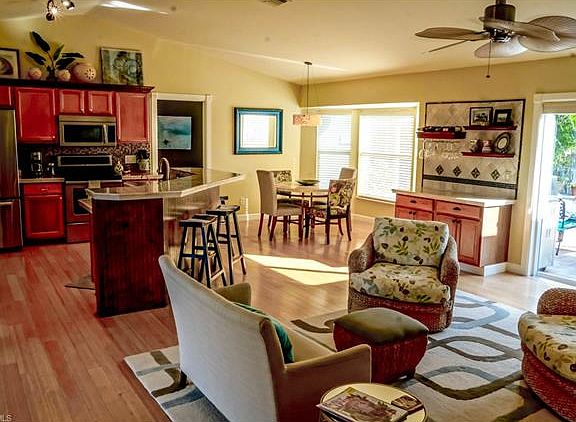 Beautiful Pool Home in SW Cape Coral. This Holiday Home was built in 2004 and totally updated with beautiful decor and details. Marble, Travertine and Granite throughout. 3 Bedrooms and 2 Bathrooms are nicely appointed and decorated with fun and inviting colors. Beautiful wood floors in main part of home. Bright Open Living space is perfect for entertaining with family and friends. Spacious Master Bedroom En-suite offers quaint sitting area, Large walk in closet and spa like Master bathroom with large tiled shower and two vanity areas. The beautiful pool is surrounded by Lush tropical landscape with fruit trees and a wide variety of Palm trees. Creating a tropical paradise get away. Fenced yard. Nice patio for sun bathing/lounging and large patio with bar is great for entertaining around the pool. Fresh exterior paint. New A/C in 2015. City utilities are in place, capital expansion of $6750 has been paid. This home is a beauty. Pack your bags and get ready to enjoy all that SW Florida has to offer.