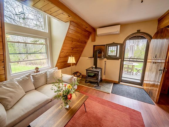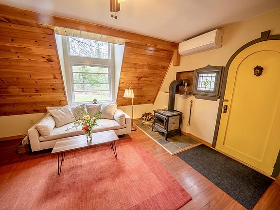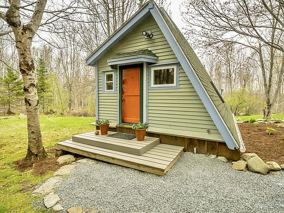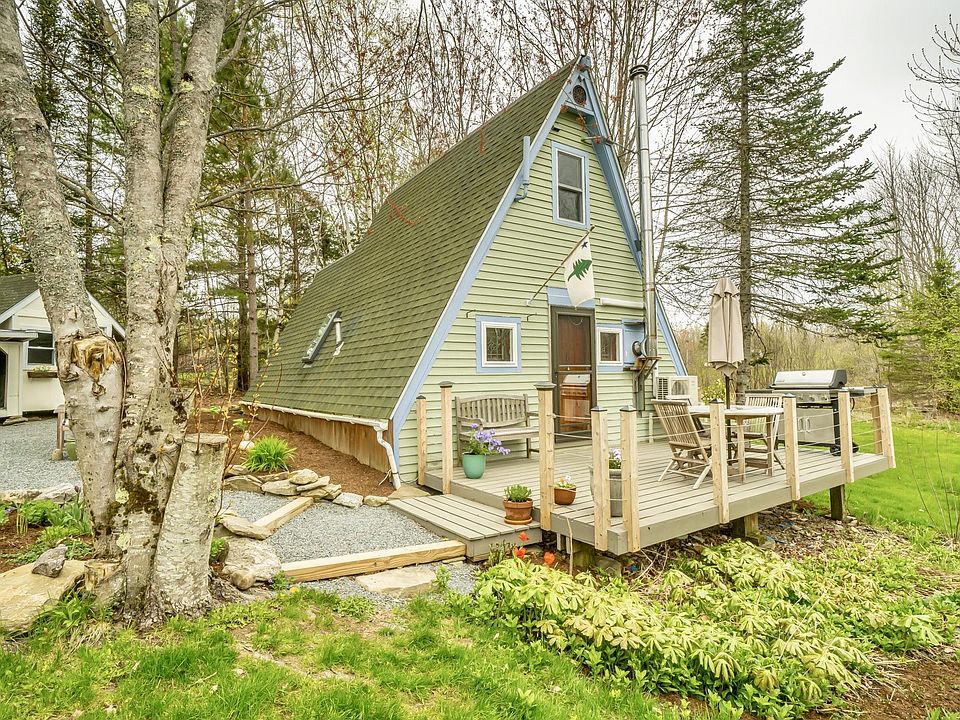 A unique, whimsical and hand-crafted A-frame home tucked away from the world, facing west to the forest, mountains and setting sun. Join a line of caretakers who have lovingly tended to this very special home which will effortlessly nourish you in return. From custom rounded wooden doors, to perfectly placed stained glass windows and storybook trim details, this getaway invites you to light a fire, pick up a book, connect with the rhythms of the seasons and feel restored.Situated on a well-landscaped 1-acre lot with native Maine perennials, newly rebuilt driveway, ample garden space, and new deck ideal for outdoor dining. Main level provides a cozy place to curl up next to the wood stove in the living area, a small library area, dormer window and full bath with skylight. Up a few steps, an efficient kitchen with newly-painted hand-made cabinetry, new appliances, and a cute Art Deco chandelier. Prepare your meals with herbs and vegetables from the gardens or local farmers market. Upstairs, a built-in writing desk and nook, large closet and room for a queen sized bed.Swan Lake park with public landing is a short drive or bike ride away. 15 minutes from picturesque downtown Belfast with art galleries, local eats, and ocean beach access. A perfect balance between country living and proximity to town. Enjoy this quiet sanctuary of a home.