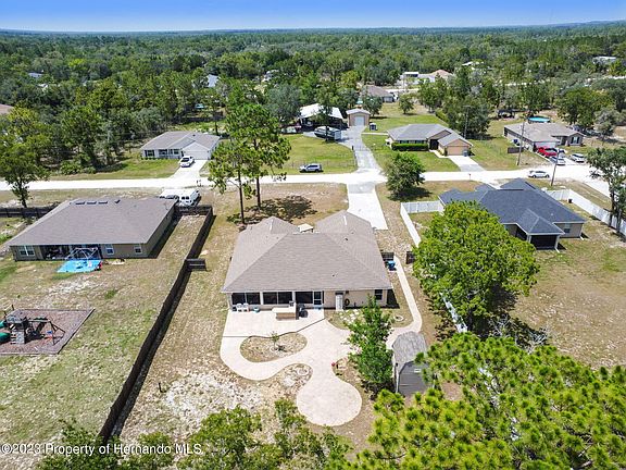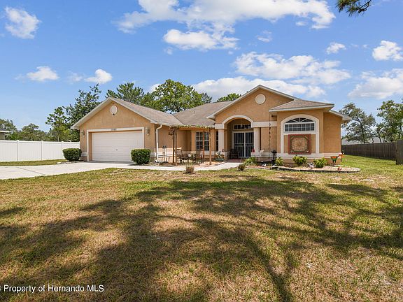 Absolutely beautiful 3 bedroom, 2 bath, 2 car garage home that sits on 0.46 acres. As you walk into the home, there is an inviting layout with a family room and separate dining room. The kitchen has a generous amount of cabinet and counter space as well as a pantry. The stainless steel appliances are all newer including a double oven and a Bosch dishwasher. The breakfast bar overlooks the family room and the breakfast nook, which is perfect for entertaining. The spacious owner's suite has double closets and an en suite bath. The owner's bath has double sinks, a garden tub, plus a nice size shower. Two additional bedrooms are in their own hallway as well as the second bathroom. There is also a pocket door to close this side of the house off which is perfect for guests or kids. The laundry room is right off of the kitchen and has an abundance of storage. There is a large screened lanai off of the back of the home that overlooks the oversized fenced back yard. There is a newer shed that offers lots of extra storage. The A/C was replaced in 2020. The home is on septic and well so no water bill here. The well tank was recently replaced. The home is located minutes from the Suncoast Expressway and lots of restaurants and shopping on SR 50.