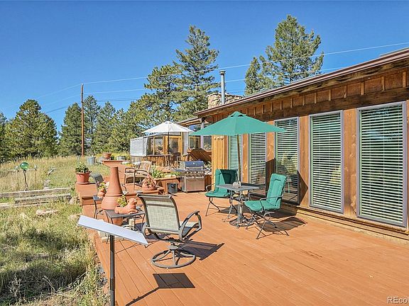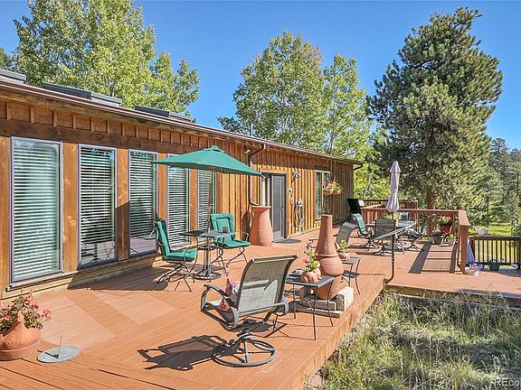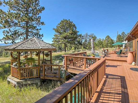 Rustic Mountain Retreat-perfect for any lifestyle you're seeking! This mountain home offers the perfect blend of character, comfort and breathtaking scenery. The wrap-around deck offers panoramic views of the mountains including Pike's Peak! Inside includes warm wood finishes, a stone fireplace and high ceilings. Designed for both relaxation and entertainment, the home features a private theater with tiered seating for movie nights or game watching parties, as well as an indoor hot tub where you can unwind and relax year round. The primary suite is a true retreat with its own spa-inspired steam shower, the perfect way to recharge after a day of mountain adventures. The attached greenhouse provides the opportunity to grow fresh herbs and flowers all year long. It's definitely a bright spot on cold snowy days. Outdoors, a beautiful gazebo and expansive decks provide the ideal setting for gatherings, from quiet morning coffee to lively parties under the stars. Animal lovers will appreciate the thoughtful outdoor amenities, including two fenced dog runs- for big and small -as well as a partially fenced pasture perfect for horses, goats, or even llamas. A large hoop storage shed adds even more versatility, offering plenty of space for equipment, toys, or small RV. Whether you're hosting friends, enjoying a family retreat, or simply soaking in the serenity of the mountains, this property combines rustic charm with modern comforts in an unforgettable setting. With its rare amenities and sweeping views, it's much more than a home - it's a dream come true! The septic tank has been replaced and inspected. Awaiting the Continued Use Permit from Jefferson County!