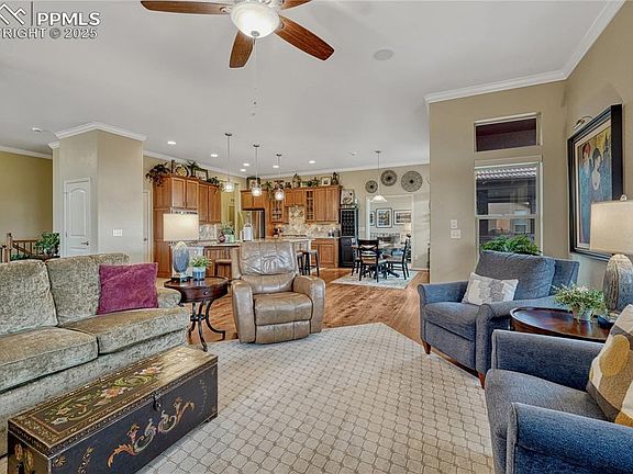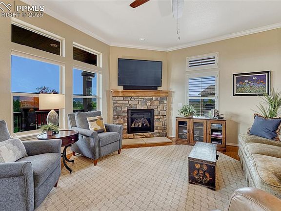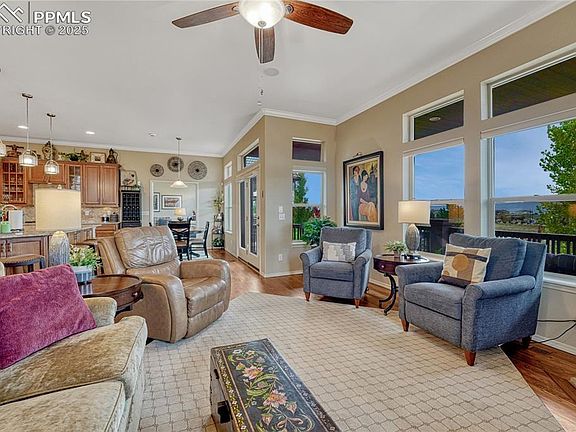 Welcome home to a meticulously maintained retreat that’s been truly cared for and loved. Step inside to gleaming Mill Run Hickory 4" plank wood floors that carry through much of the main level and set the tone for easy, open concept living. The spacious living room flows into a gourmet kitchen featuring rich cherry cabinetry, granite countertops, stainless appliances, a walk-in pantry, and a separate dining room. A flexible den/office adds to the everyday function everyone wants. A wall of windows frames unbeatable Front Range views, and UV film helps filter 95% of rays for comfort and protection. For true main-level living, the primary suite offers an ensuite bath and walk-in closet, joined by a convenient guest bath and a laundry room with utility sink. Downstairs, the light and bright walkout basement opens to an expansive family room—perfect for game day, movie night, or hosting a crowd. There is a second primary suite with attached bath, two additional bedrooms and a guest bath which means there is space for everyone and everything. This home has it all: thoughtful finishes, smart layout, and those Colorado views you’ll never get tired of.