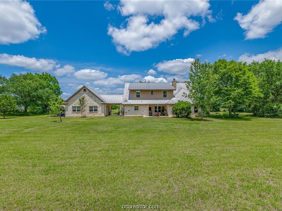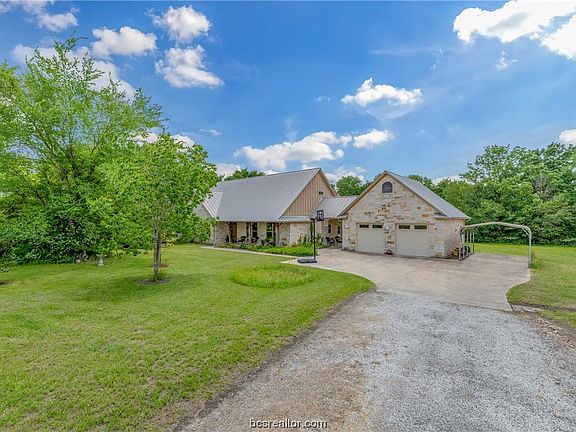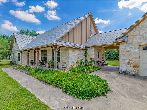This is a RARE FIND - absolute gem of a property… 5 very private acres in south College Station with a delightful, one owner custom-built Austin stone home adorned with galvalume metal roof. Three bedrooms, two and one half baths downstairs and two bedrooms, one bathroom up. Light, natural hardwood floors adorn much of the home. The open first floor is bathed in natural light and features a great room anchored by a chopped stone fireplace, dining area with pocket study around the corner, kitchen open to dining and great room, and a modular area under the stairs that can easily convert between additional storage or an adorable play nook. Whisk up the stairs to a second pocket study area in the landing with plentiful decked attic space beyond and plenty of clearance to allow for potential expansion. Newer HVAC system installed in 2020. Oversized two car garage connects to main residence by breezeway with additional decked storage above and shop area below. This hill country residence is tucked back on the acreage, adding privacy, and features native trees and a creek composing the rear property line. Make plans to see this amazing property!